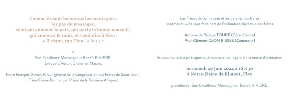 Cher(e)s frères, soeurs, oblats et amis, nous sommes heureux de vous faire part des ordinations de nos frères qui auront lieu le 29.06.2024 à la chapelle des frères de Rimont. Les frères de la communauté de Rimont seront honorés de votre présence pour entourer nos frères qui recevront les ordres sacrés. Pour ce faire, vous êtes priés de prendre contact avec l’hôtellerie de Rimont afin de vous faire enregistrer et que les meilleures dispositions soient prises pour l’évènement.