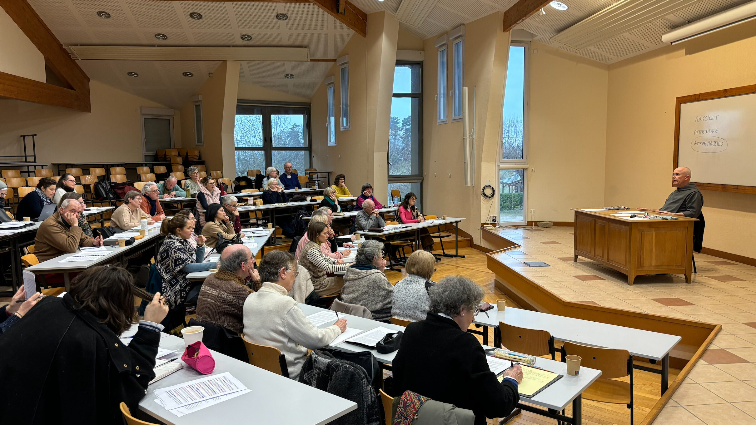Alors que les salles de cours du prieuré de Rimont ont pour habitude d’être désertées chaque week-end par les étudiants en théologie, elles furent, durant trois jours, particulièrement animées par d’étranges élèves! Quarante personnes – du cru ou de terres plus lointaines, jeunes et moins jeunes, seules ou en couple… – sont venues vivre un temps fort consacré au discernement spirituel les 24, 25 et 26 janvier derniers.